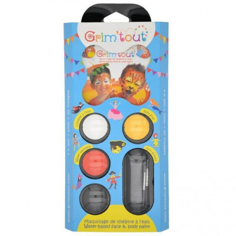 Paleta de tintas para pinturas faciais para festa. Inclui pincel, esponja, livro e 4x3ml de tinta à base de água, antialérgica, sem parabenos, de fácil remoção. Com estas tintas fará 30 pinturas diferentes.