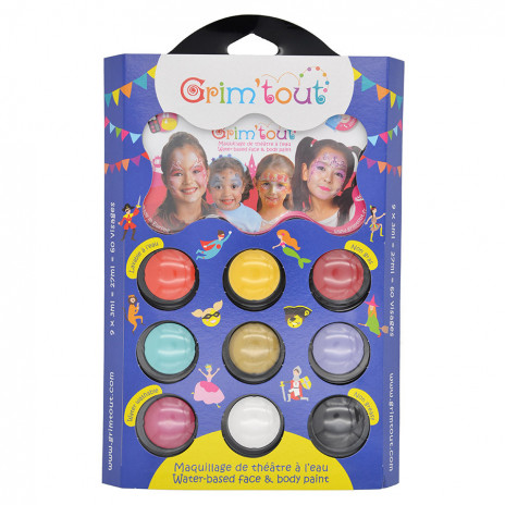 Paleta de tintas para pinturas faciais para festa ou carnaval de princesas. Inclui pincel, esponja, livro e 9x3ml de tinta à base de água, antialérgica, sem parabenos, de fácil remoção. Outras paletas temáticas da marca Grim'tout disponíveis.