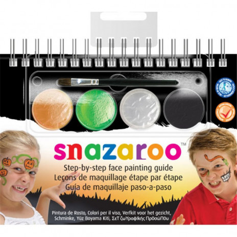 Kit composto por 4 cores para pintura de rosto da Snazaroo e guia passo a passo de como pintar várias faces com o tema Halloween.