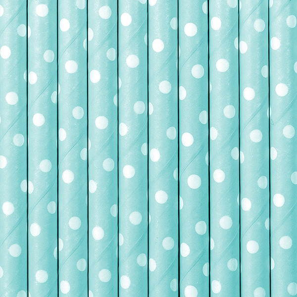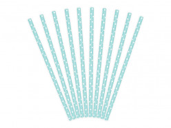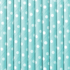Palhinhas em papel de cor azul céu com bolinhas brancas com cerca de 19.5cm de comprimento.Cada conjunto contém 10 palhinhas.