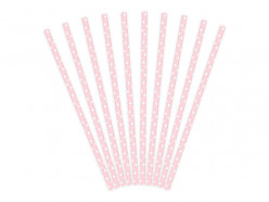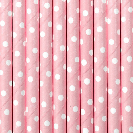 Palhinhas em papel de cor rosa bebé com bolinhas brancas com cerca de 19.5cm de comprimento.Cada conjunto contém 10 palhinhas.
