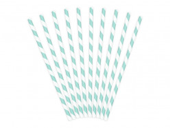 Palhinhas em papel de cor azul céu com listas brancas com cerca de 19.5cm de comprimento.Cada conjunto contém 10 palhinhas.