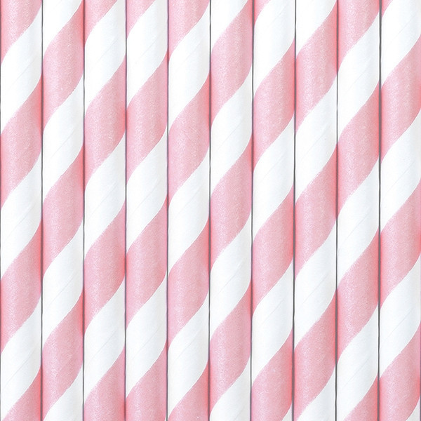 Palhinhas em papel de cor rosa bebé com listas brancas com cerca de 19.5cm de comprimento.Cada conjunto contém 10 palhinhas.