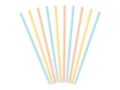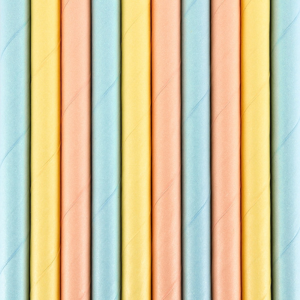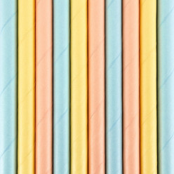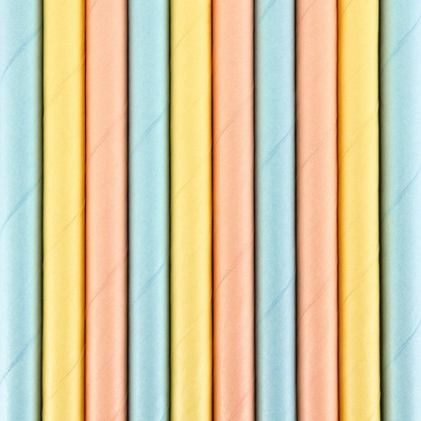 Palhinhas em papel de cor turquesa, amarelo e pêssego com cerca de 19.5cm de comprimento. Contém 4 palhinhas azul turquesa, 3 amarelas e 3 cor de pêssego.