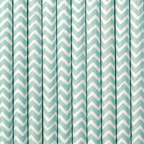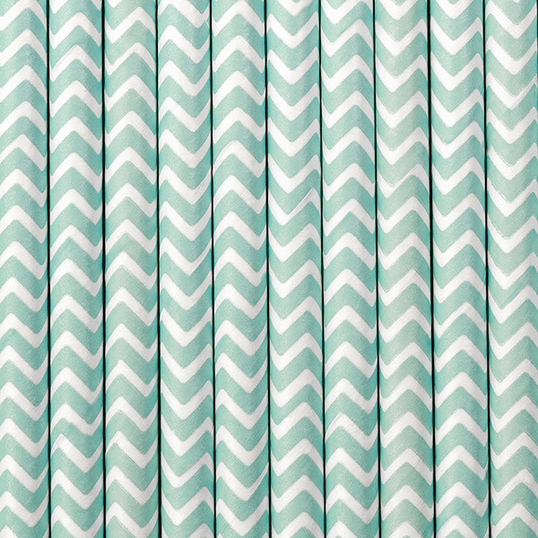Palhinhas em papel de cor azul céu com padrão ziguezague em branco com cerca de 19.5cm de comprimento.Cada conjunto contém 10 palhinhas.