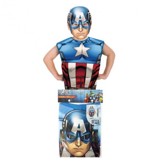 Fato disfarce composto por camisola de manga cava e mascara em cartão, do famoso herói da Marvel: o Capitão América