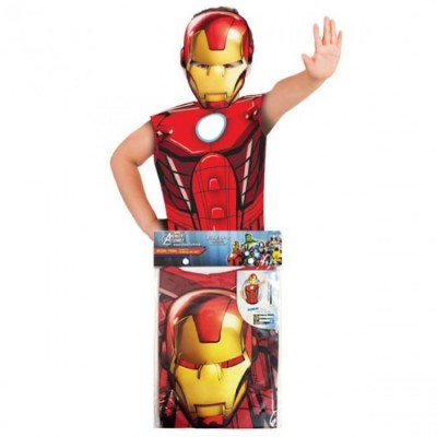Fato disfarce composto por camisola de manga cava e mascara em cartão, do famoso herói da Marvel: o Homem de Ferro.