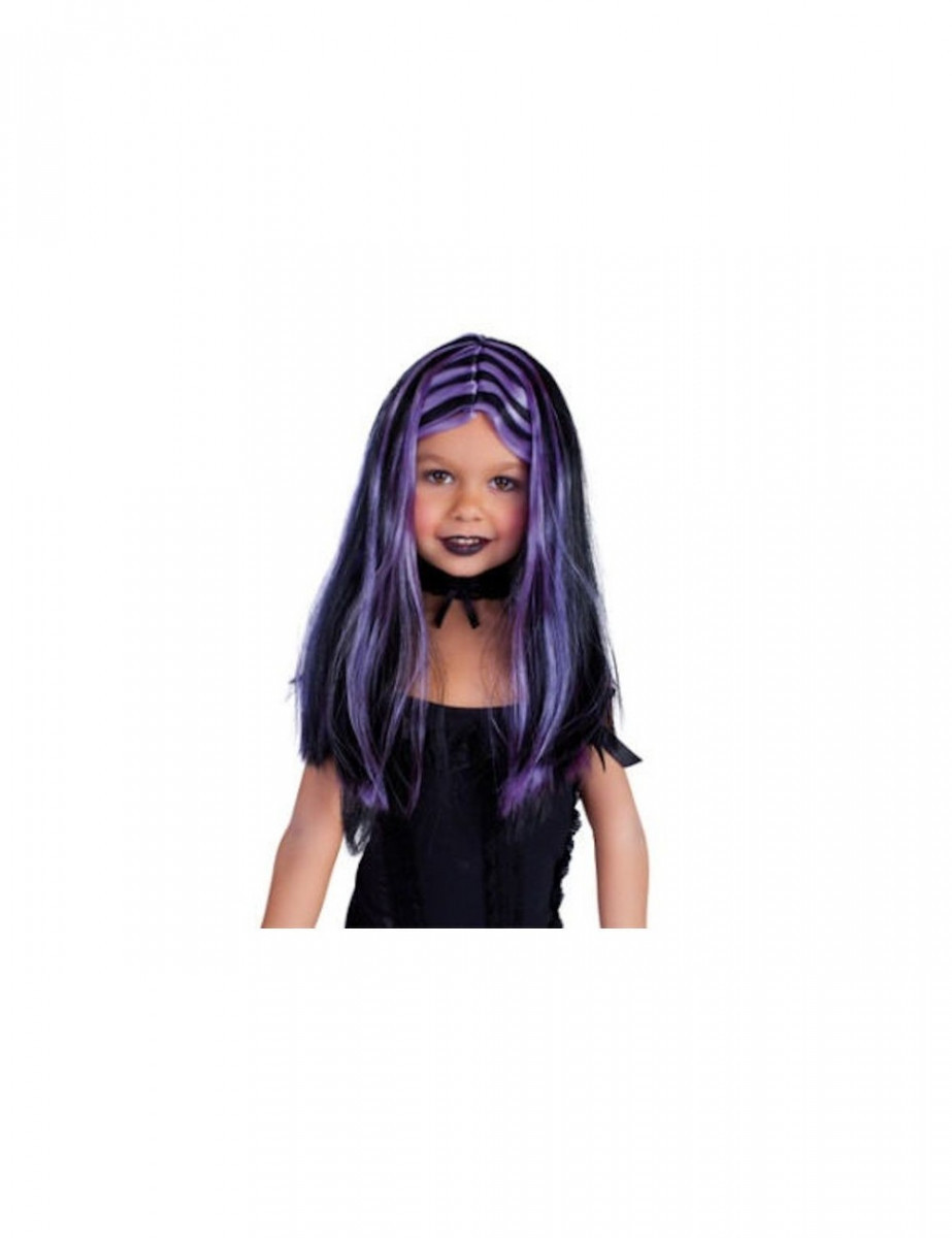 Peruca preta com madeixas em lilás para bruxinha para o Carnaval ou Halloween.