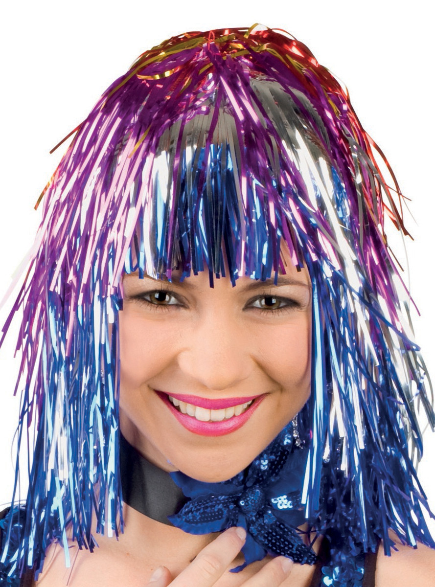 Excelente acessório para completar a sua fantasia de Carnaval. Peruca de fitas coloridas metalizadas/brilhantes para mulher.