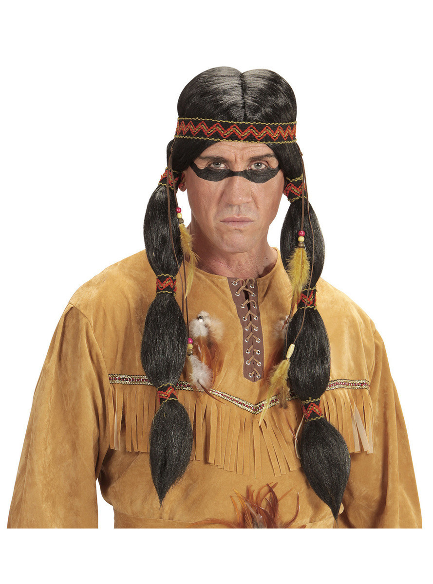 Peruca preta com fita para disfarce de índio adulto. O cabelo é brilhante e amarrado nas laterais com fitas a combinar.