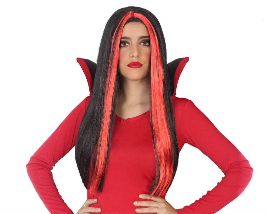 Peruca preta com madeixas vermelhas para disfarce no Carnaval ou Halloween.
