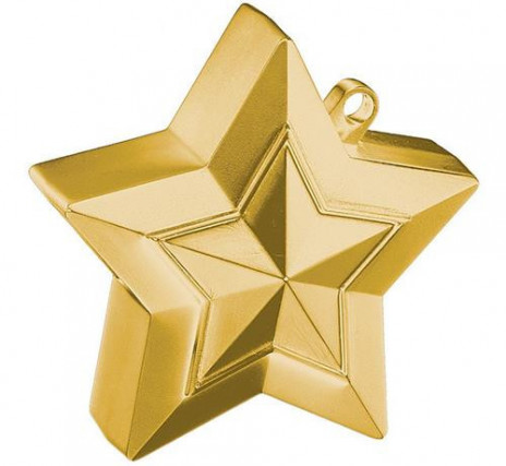 Peso dourado em forma de estrela, para amarrar balões de foil ou látex cheios com hélio com 170 gramas de peso e 6 cm de diâmetro na base. Também disponível em cor rosa fúscia, azul e prateado.