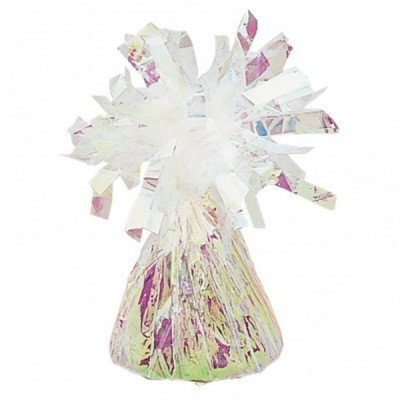 Peso iridescente, que reflete as cores do arco-íris, para amarrar balões de foil ou latex cheios com hélio com 170 gramas de peso e 6 cm de diâmetro na base. Também disponível em cor azul e rosa.