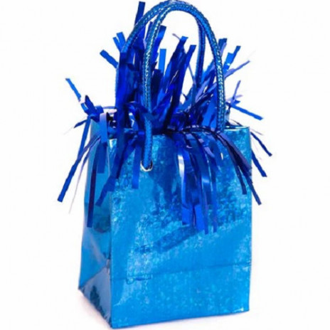 Peso de cor azul royal com formato de mini saco para amarrar balões foil ou latex cheios com hélio com 200 gramas de peso e 15 cm de altura.