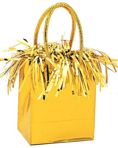 Peso de cor dourada com formato de mini saco para amarrar balões foil ou latex cheios com hélio com 200 gramas de peso e 15 cm de altura.