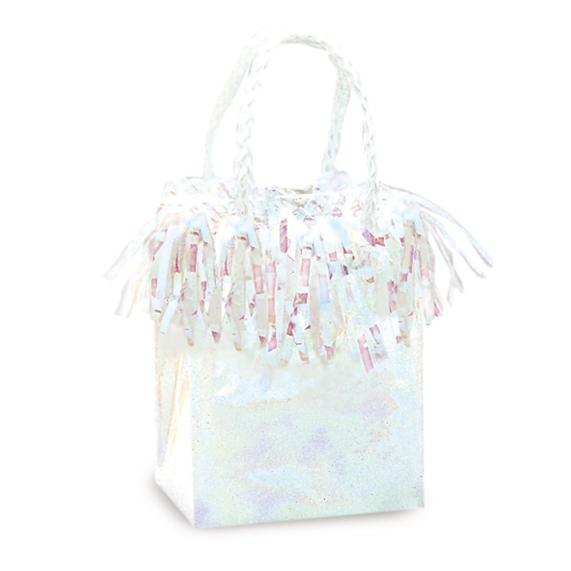 Peso iridescente com formato de mini saco para amarrar balões foil ou latex cheios com hélio com 200 gramas de peso e 15 cm de altura.