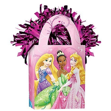 Peso de cor rosa com imagem das 6 princesas da Disney, Bela, Ariel, Cinderella, Aurora, Tiana e Rapunzel, para amarrar balões de foil ou latex cheios com hélio com 156 gramas de peso e base retangular 7x3cm