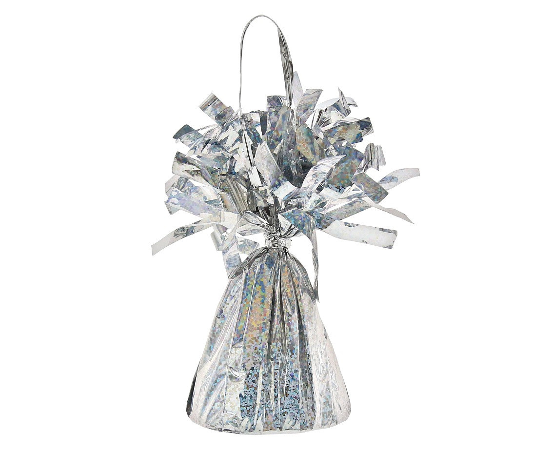 Peso em tons de prata holográfico para amarrar balões de foil ou latex cheios com hélio com 145 gramas de peso e 6 cm de diâmetro na base