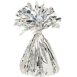 Peso de cor prata para amarrar balões de foil ou latex cheios com hélio, com 170 gramas de peso e 6 cm de diâmetro na base.