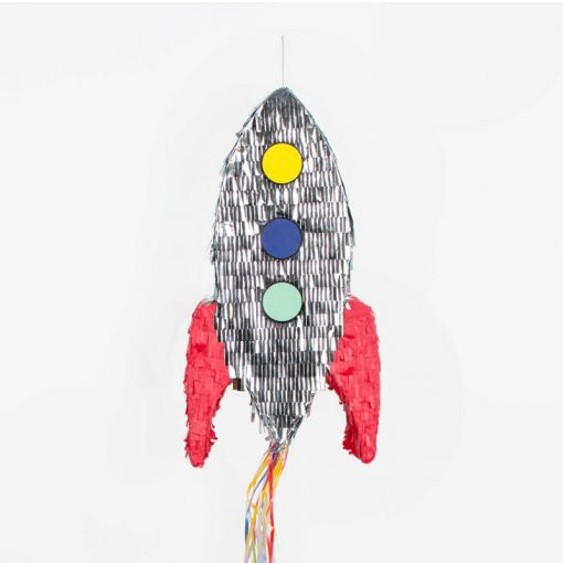 Pinhata em cartão reciclado para festa de aniversário em forma de foguetão. Uma pinhata fornecida sem qualquer recheio.
