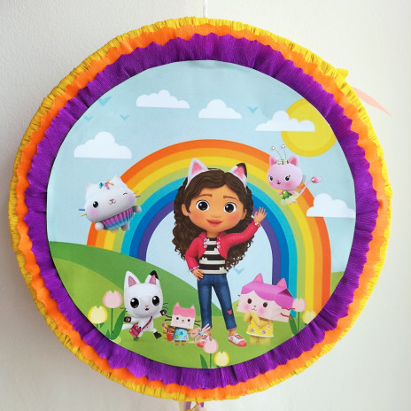 Pinhata artesanal em formato redondo de Gabby's Dollhouse com as dimensões aproximadas de 36x10cm.