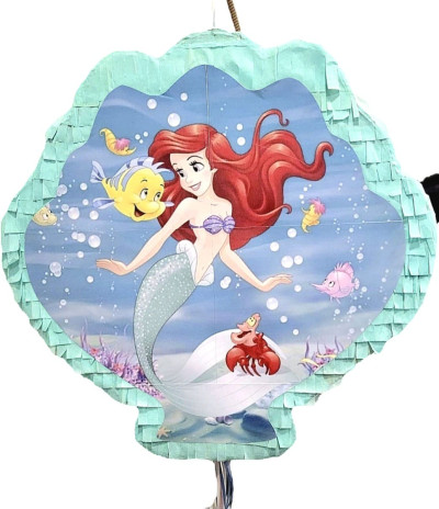 Pinhata grande em forma de concha da Princesa Ariel da Disney, com cerca de 12 fitas para as crianças puxarem e descobrirem, os brindes ou guloseimas surpresa oferecidos pelo anfitrião da festa.