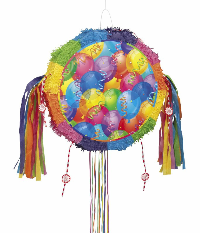 Pinhata grande de forma redonda, com desenhos de balões multicoloridos de ambos os lados e confetis. Possui 24 fitas para as crianças puxarem