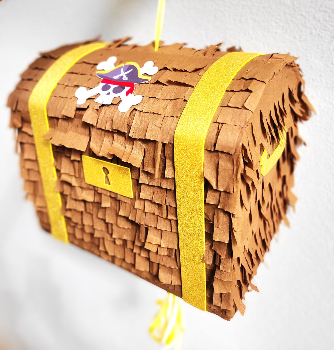 Pinhata de báu do tesouro de piratas em 3D, para te divertires na tua festa de aniversário com o mesmo tema.