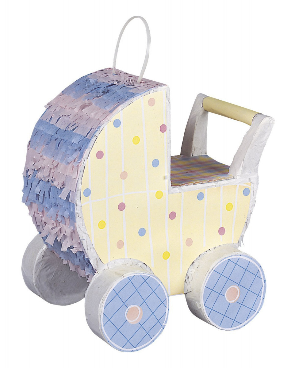1 Pinhata pequena em forma de carrinho de bebé para jogar, com as medidas de 25.4cm x 24.1cm e capacidade para até 900 gramas de doces e pequenos presentes para festas.