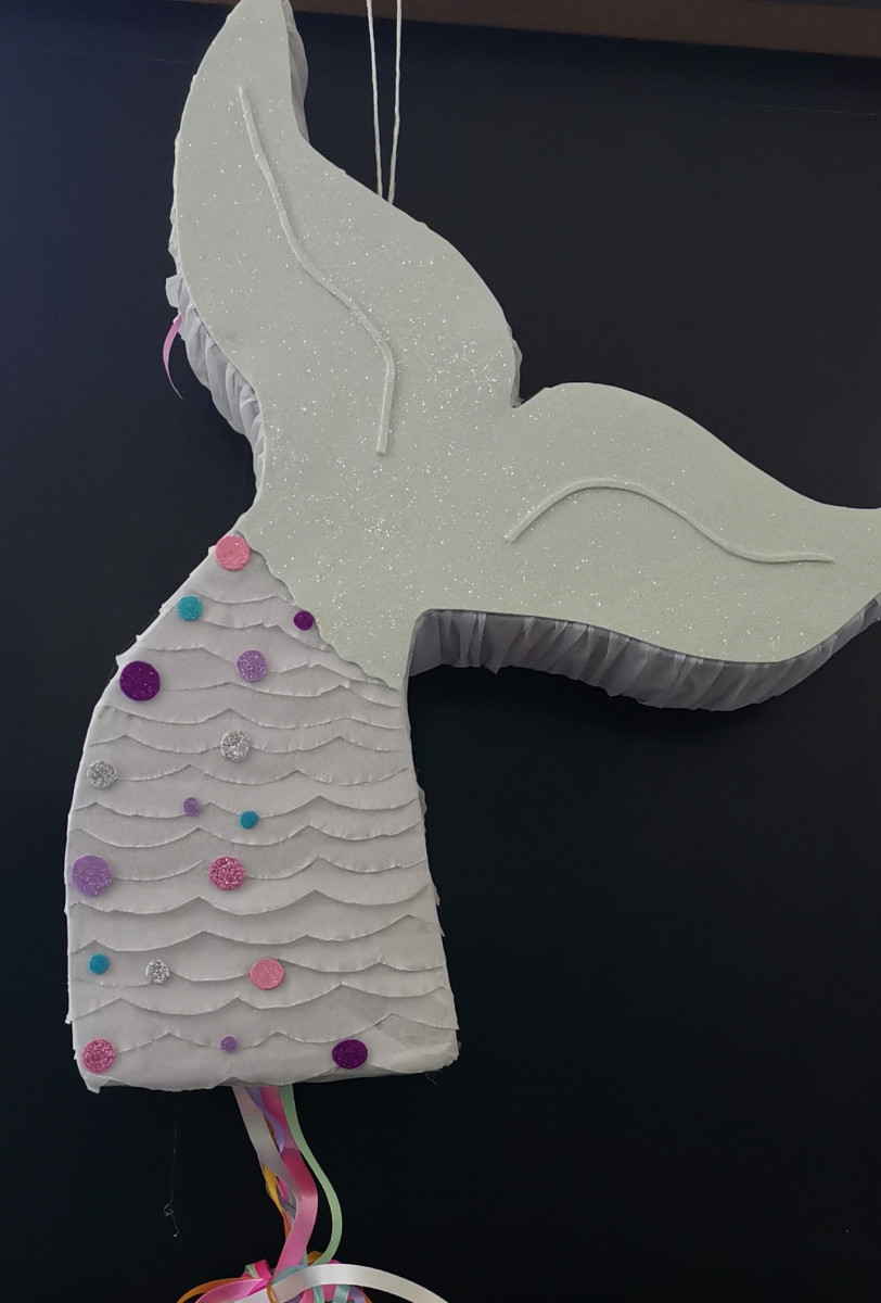 Pinhata artesanal de cauda de sereia em branco com glitter com as dimensões aproximadas de 45x40x10cm. Com fitas em cetim.