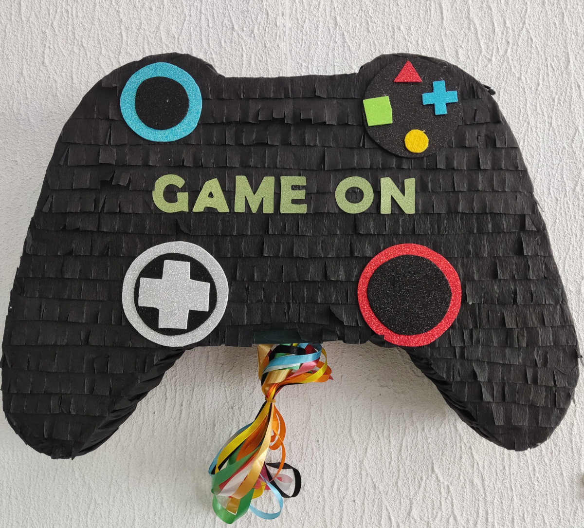 Pinhata artesanal de comando da consola com as dimensões de 44x30x10cm. Poderá ir com a inscrição "Parabéns" ou "Game On".