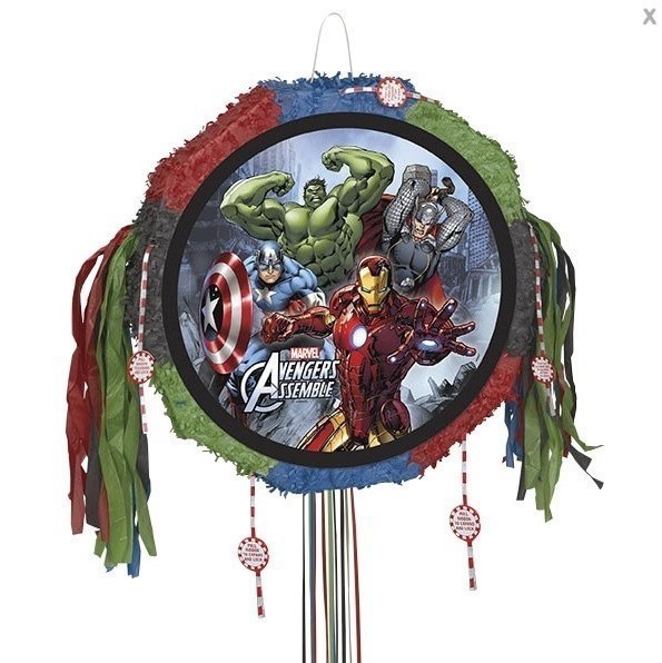 Pinhata dos Avengeres,para te divertires na tua festa de aniversário, em forma de tambor vem com imagem dos Avengers brilhantes em ambos os lados, com acabamento de papel acetinado e com franjas sobre uma base de papelão leve e cordas suficientes para aproximadamente 12 jogadores.