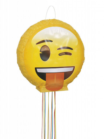 Pinhata redonda em forma de emoji. É coberta de franjas de papelão na cor amarela e tem um acabamento em papel acetinado com a imagem do emoji. Possui uma alça para poder pendurá-la.