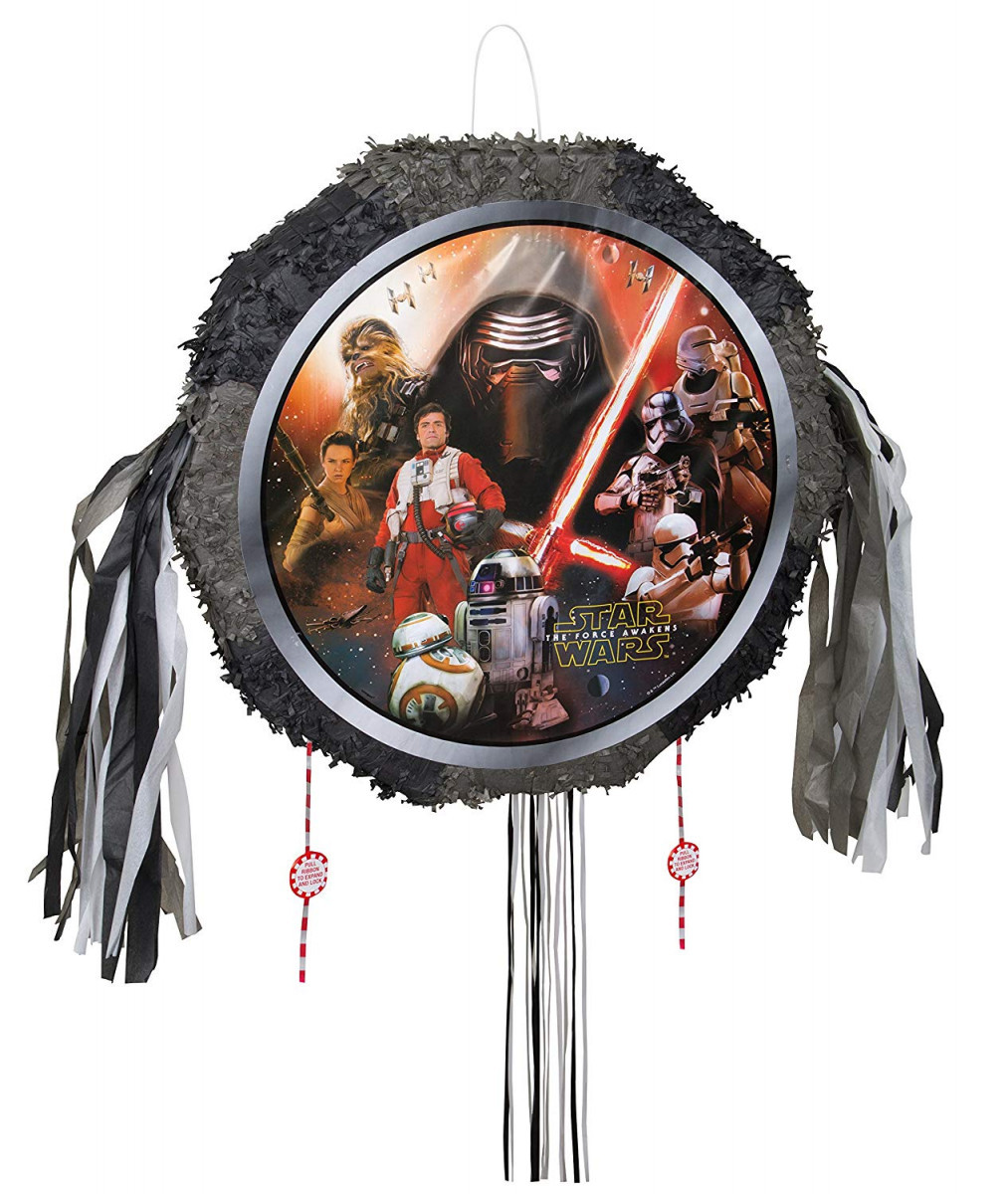 Pinhata da saga Star Wars, para se divertir na sua festa de aniversário, em forma de tambor e vem com imagem dos Star Wars, com acabamento de papel acetinado e com franjas sobre uma base de papelão leve e cordas suficientes para aproximadamente 12 jogadores.
