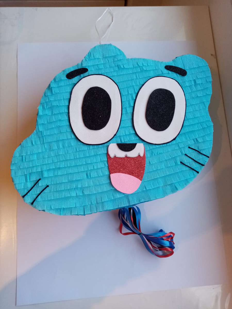 Pinhata artesanal com os formato da cara do Gumball com as dimensões aproximadas de 46x44x11cm.