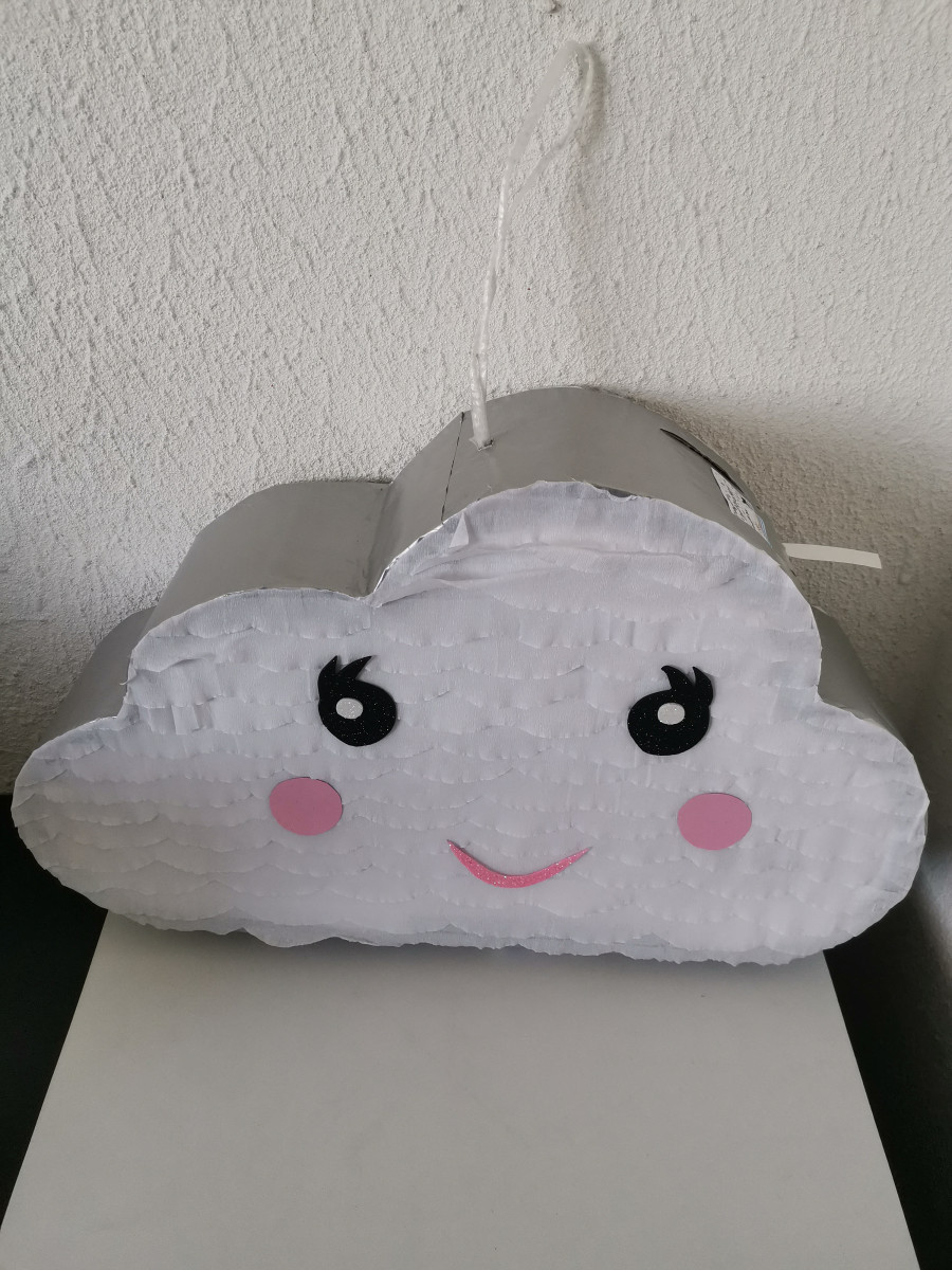 Pinhata em forma de nuvem com brilhos para colocar doces e pequenos presentes para festas.
