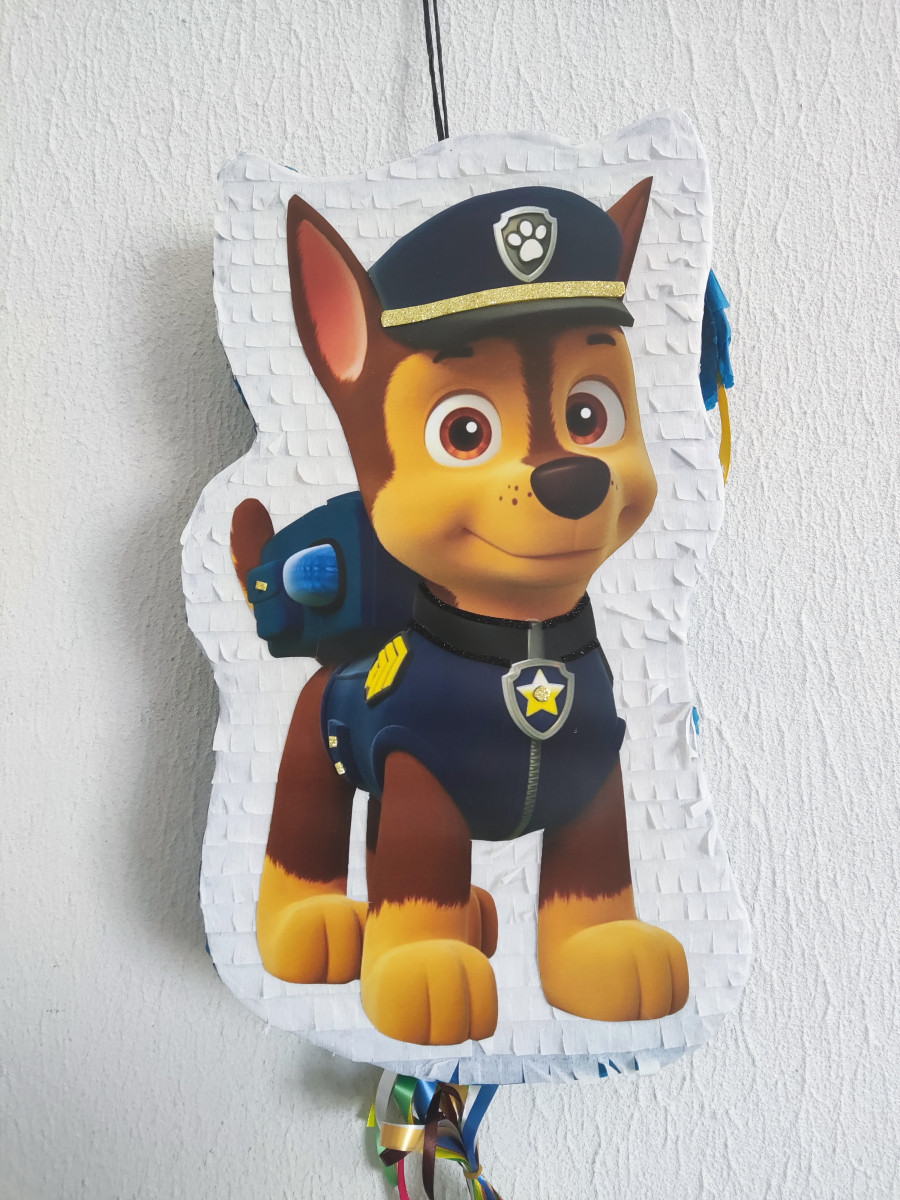 Pinhata artesanal do Chase da Paw Patrol com as dimensões aproximadas de 41x24x10cm.