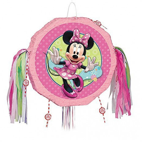 Pinhata em tons de rosa e verde da Minnie da Disney. Com um fantástico acabamento de papel acetinado sobre uma base de papelão leve e cordas coloridas, suficientes para aproximadamente 12 jogadores.