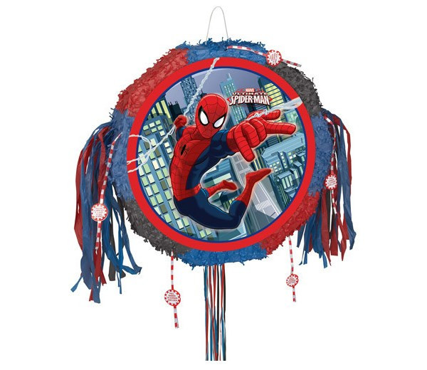 Pinhata em tons de vermelho e azul do Spiderman da Marvel. Com um fantástico acabamento de papel acetinado sobre uma base de papelão leve e cordas coloridas, suficientes para aproximadamente 12 jogadores. Inclui uma abertura, para a colocação de doces ou brindes que cairão ao ser puxados pela fita certa, ou se preferir para partir com um bastão. Bastão e venda vendidos à parte.