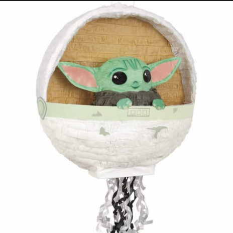 Pinhata em 3D da cápsula do Baby Yoda do filme Star Wars The Mandalorian, para se divertir na sua festa de aniversário. Com cerca de 16 fitas para puxar.