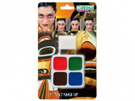 Maquilhagem para disfarce de carnaval com 4 tons diferentes, vermelho, verde, castanho e azul.