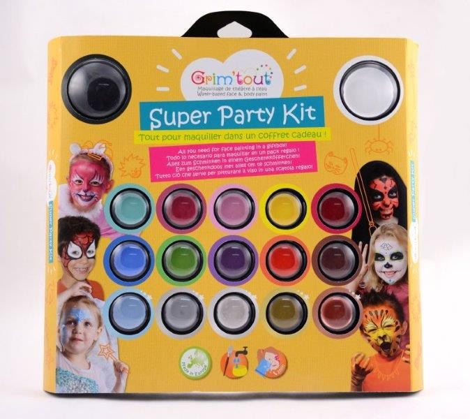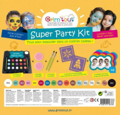 Paleta de tintas para pinturas faciais para festa. Inclui paleta de 17 cores (branco e preto de 7mL e restantes de 2mL), 2 pincéis, 2 esponjas, 2 stencil e 8 guias passo-a-passo.