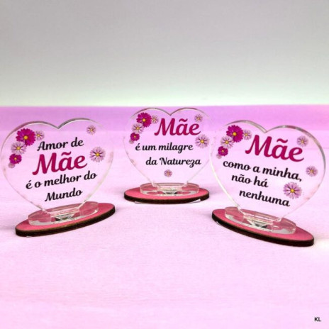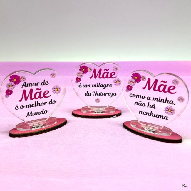 Placa Acrílica, em coração, Dia da Mãe, com as mensagens: