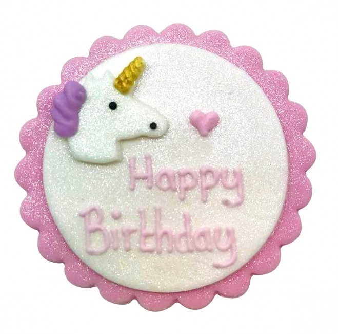 Placa em açúcar para decoração de bolo de aniversário, com cabeça de Unicórnio com diâmetro aproximado de 8cm.