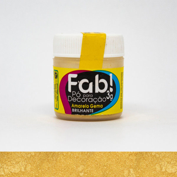 O pó para decoração Amarelo gema faz parte da linha dos brilhantes da Fab!, esta cor é diferente da cor amarelo canário conhecido por todos, pois a sua cor é mais aberta e um pouco mais escura. Misturando o amarelo gema com o vermelho rubi dará um laranja fabuloso. Pode ser aplicado a seco em camadas e superfícies finas, com auxílio dum pincel de cerdas macias. Também pode ser diluído na Solução Alcoólica Neutra da Fab! (desenvolvida especialmente para esse tipo de uso) e utilizada na bombinha/pulverizador ou aerógrafo. É indicado para decorar superfícies finas como chantilly, chantininho, pasta americana, pasta de açúcar, pasta de flores, pasta de feijão, chocolate, biscoitos, glacê real, macarons e etc.