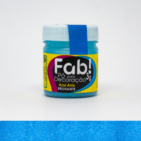 O pó para decoração azul anis faz parte da linha dos brilhantes da Fab!, entre as cores azul jeans e azul tiffany, é o azul mais claro e com uma cor mais viva. Pode ser aplicado a seco em camadas e superfícies finas, com auxílio dum pincel de cerdas macias. Também pode ser diluído na Solução Alcoólica Neutra da Fab! (desenvolvida especialmente para esse tipo de uso) e utilizada na bombinha/pulverizador ou aerógrafo. É indicado para decorar superfícies finas como chantilly, chantininho, pasta americana, pasta de açúcar, pasta de flores, pasta de feijão, chocolate, biscoitos, glacê real, macarons e etc.