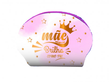 Porta-moedas do Dia da Mãe em rosa e branco com apontamentos em dourado com a frase "Mãe ninguém brilha como tu".