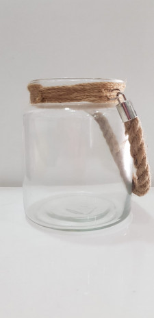 Em vidro, um pote para colocar uma vela com uma corda para decoração.