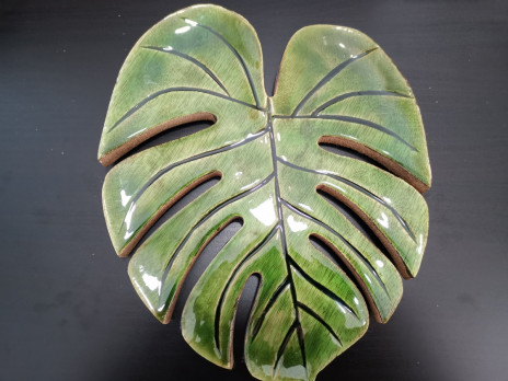 Prato com base em madeira em formato de folha para decoração ou para qualquer festa. Revestido em cerâmcia para ser mais facilmente lavável. Com material antiderrapante na base.
