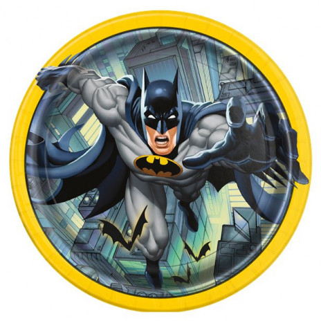 Pratos 21,9 cm de diâmetro com ilustração do Batman, para tornar a tua festa de aniversário ainda mais divertida.